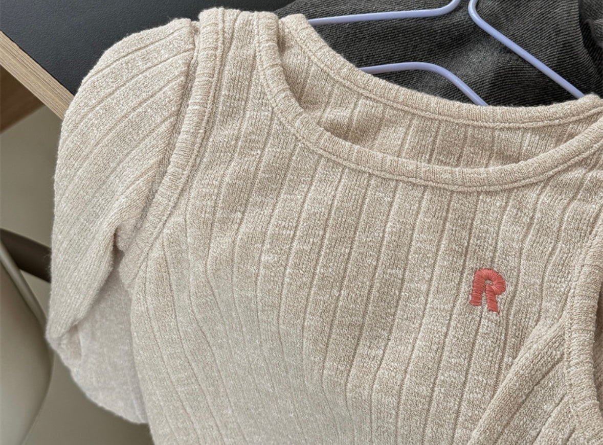 胸元にワンポイントで入った「R」の刺繍がかわいい、シンプルなリブカットソー。